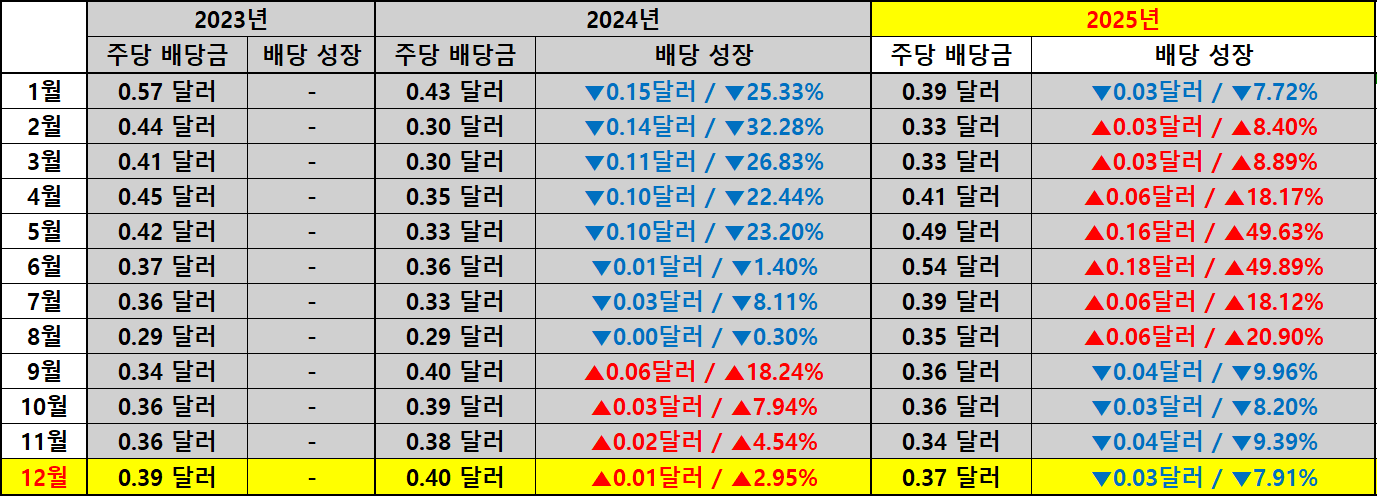 다만 배당금 자체만 놓고 보면 전년 동기 대비 소폭 감소한 모습입니다. 지난해 12월 배당금은 0.40달러였고 올해는 0.37달러로 약 0.03달러 줄어들었습니다. 비율로 환산하면 약 -7.91% 감소인데 이는 JEPI가 옵션 프리미엄 수익에 크게 의존하는 구조이기 때문에 시장 변동성 환경에 따라 배당금이 유동적으로 조정되는 특성이 그대로 반영된 결과로 해석됩니다.