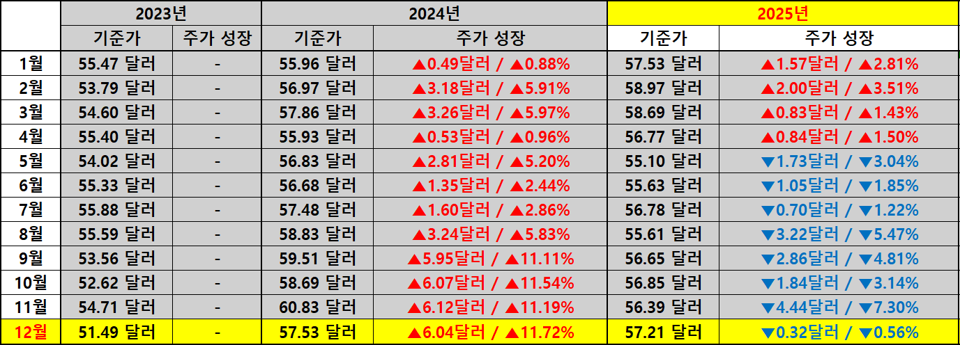 배당과 함께 반드시 함께 봐야 하는 부분이 주가 흐름입니다. 배당락일 기준으로 보면 지난해 57.53달러였던 주가는 올해 57.21달러로 약 -0.32달러 하락했습니다. 비율로는 -0.56% 수준으로 사실상 보합권에 가까운 움직임이었습니다.
