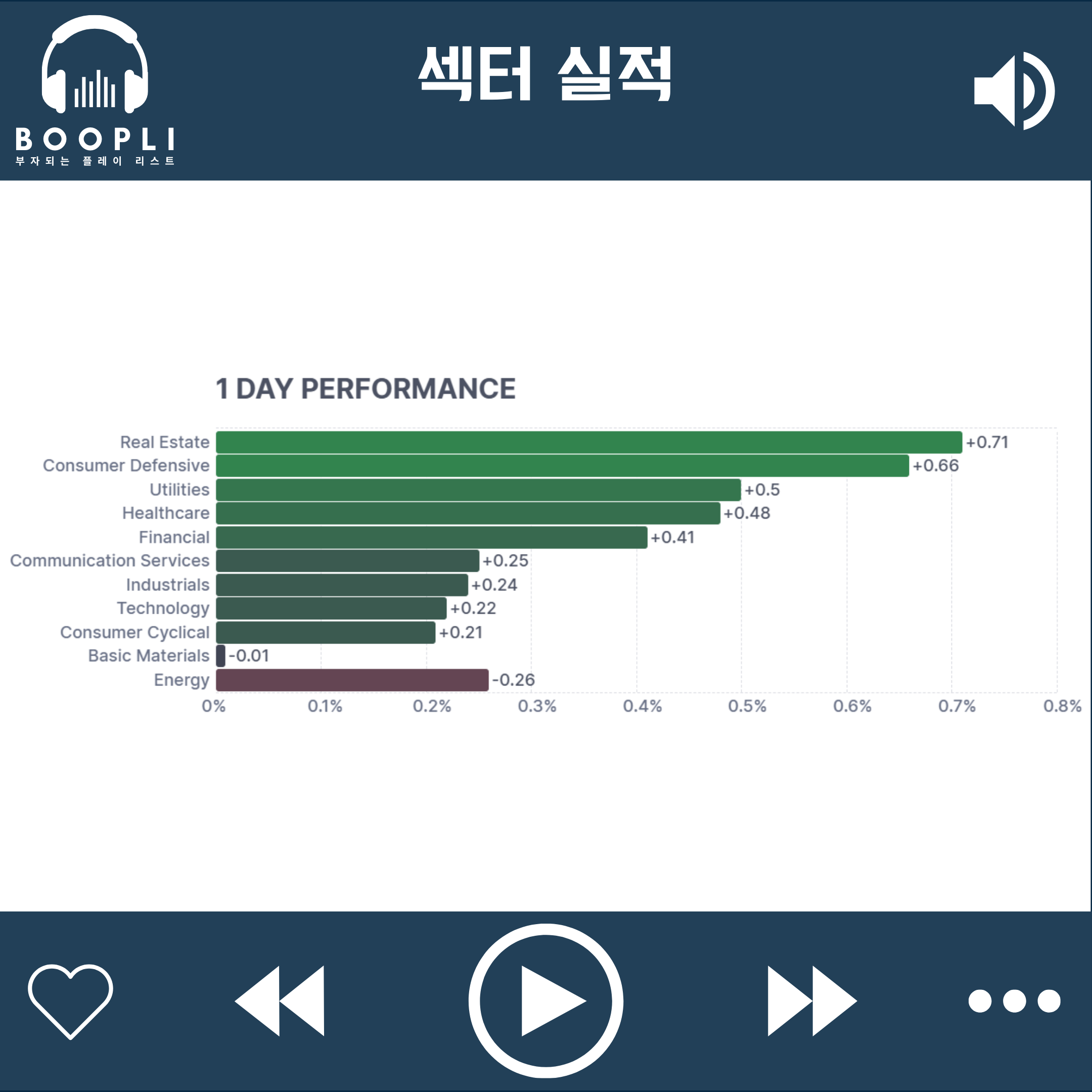 부동산 섹터가 상승을 주도했고, 이어서 경기 방어주, 유틸리티 순으로 강세