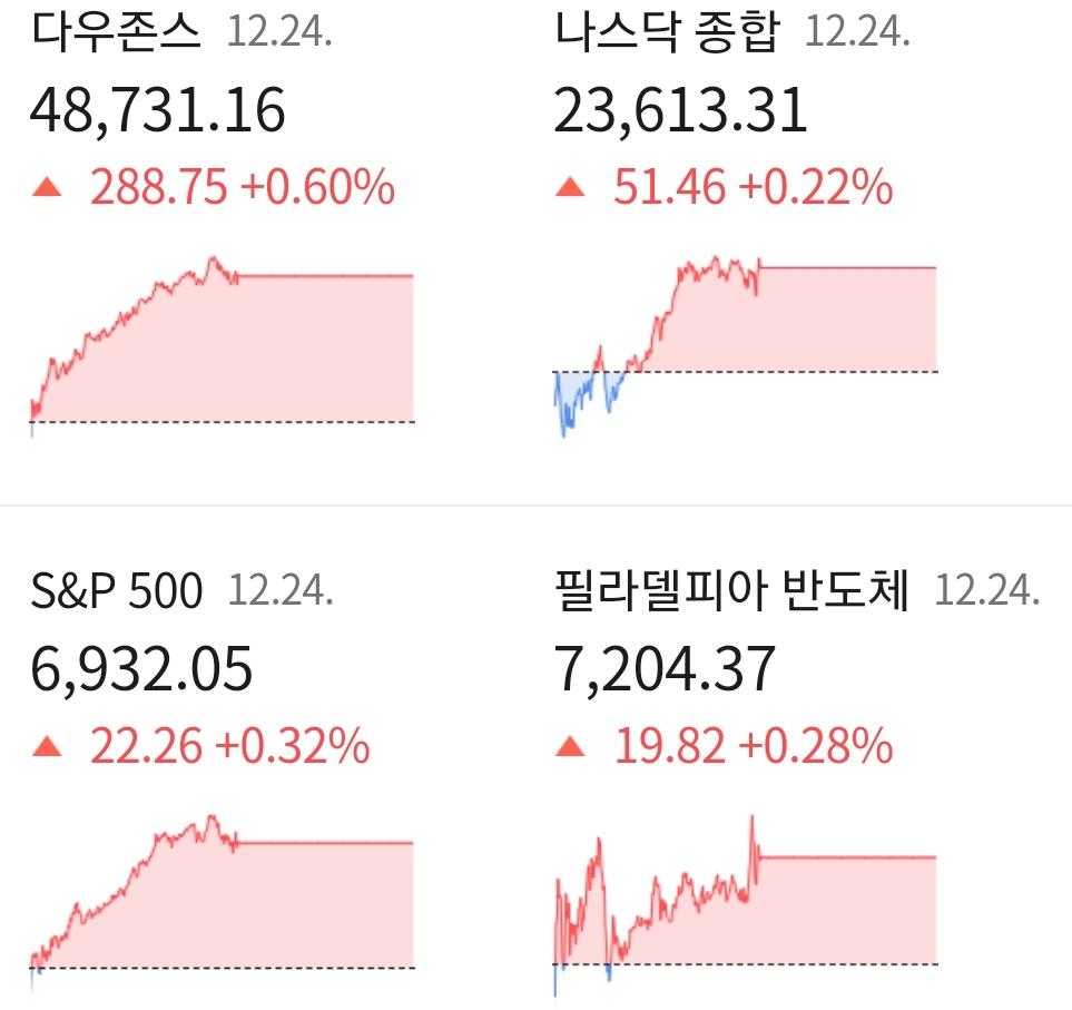다우지수는 전일 대비 +0.60% 상승한 48,731.16에 장을 마감하였으며, 대형주 중심의 S&P500 지수는 전장 대비 +0.32% 오른 6,932.05에 거래를 마쳤습니다. 기술주 중심의 나스닥 지수는 전 거래일 대비 +0.22% 상승한 23,613.31에 거래를 마치며 장을 마감하였습니다.