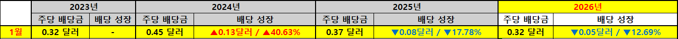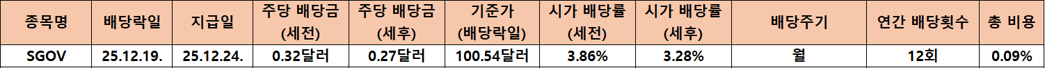 이 부분이 중요한 이유는 SGOV의 배당 구조 때문입니다. SGOV는 매월 배당을 지급하는 ETF이지만 매년 12월에는 예외적으로 배당이 두 차례 지급되고 다음 해 1월에는 별도의 배당이 지급되지 않습니다. 즉 12월 말에 지급되는 두 번째 배당이 회계상 다음 해 1월 배당으로 처리되는 구조이며 이번 배당 역시 그에 해당합니다. 따라서 ‘1월 배당’이라는 표현은 시점상의 명칭일 뿐 실제 현금 흐름은 12월에 이미 발생했다는 점을 함께 이해하는 것이 중요해 보입니다.