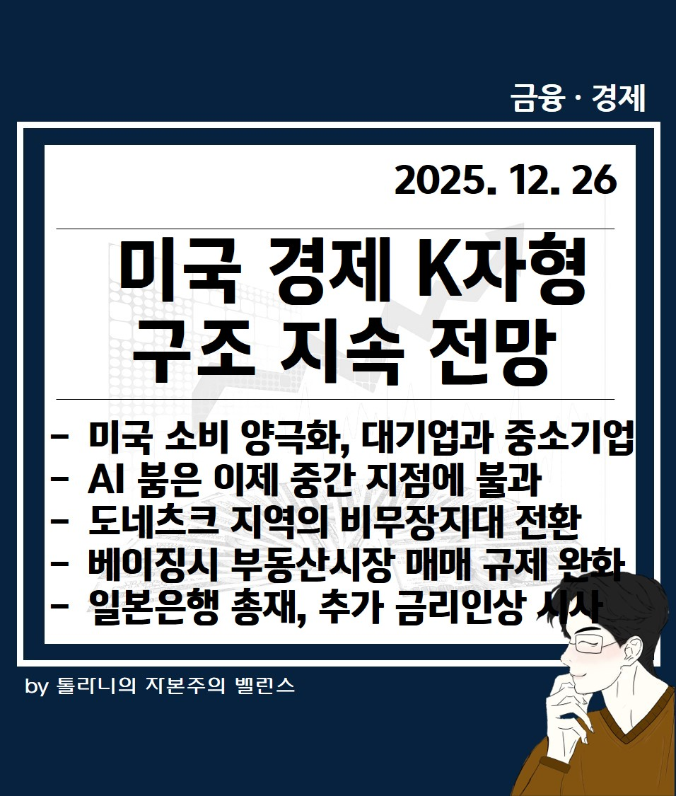 ● 연말을 맞아 내년 미국 경제 전망에 관심이 고조. 미국 경제의 핵심은 소비이며, 이와 관련하여 최근의 가장 큰 특징은 소비 양극화로 대변되는 K자형 구조. 특히 주식, 금, 은, 일부 부동산 가격 상승 등의 혜택을 누리는 고소득층과 노동소득 의존도가 큰 저소득층의 소비 격차가 점차 확대. 인플레이션 압력이 이어지면서 관련 현상은 심화