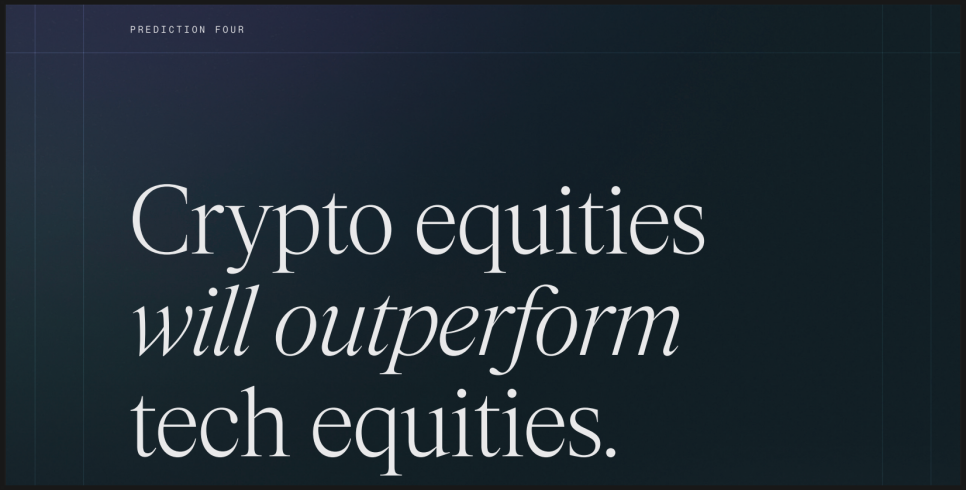네 번째, 비트와이즈는 코인 관련주들의 주가가 기술주를 앞설 거라 예측하고 있습니다. 비트와이즈는 규제 환경이 명확해질수록, 코인베이스나 서클처럼 실제 매출과 사업을 가진 기업들이 더 큰 수혜를 볼 수 있다고 봅니다. 새로운 상품 출시, 수익원 확대, 인수합병이 이어지면서 2026년에는 크립토 관련 주식이 전통 기술주를 다시 앞설 수 있다는 전망입니다.