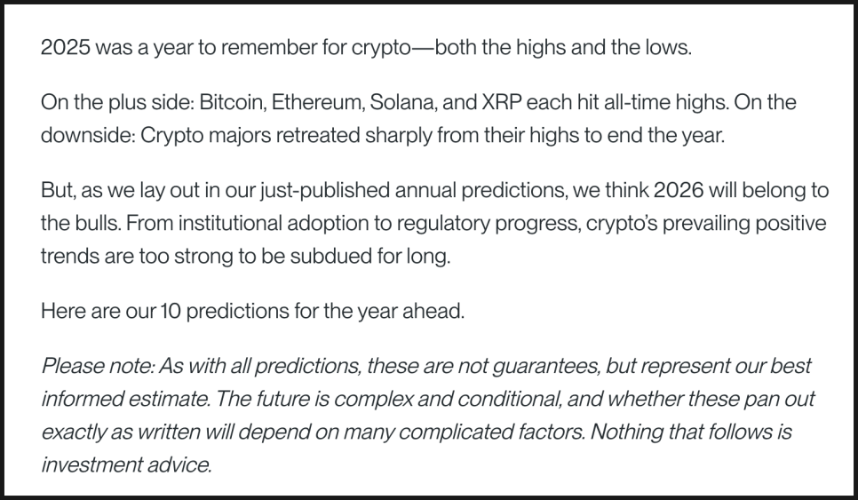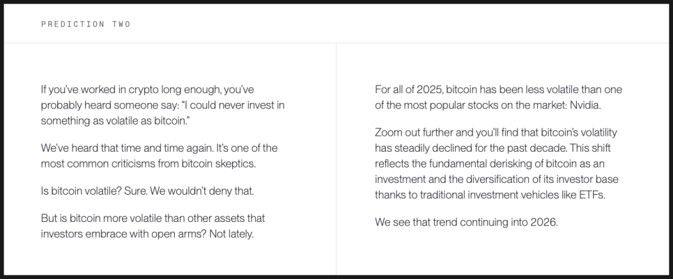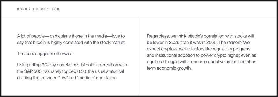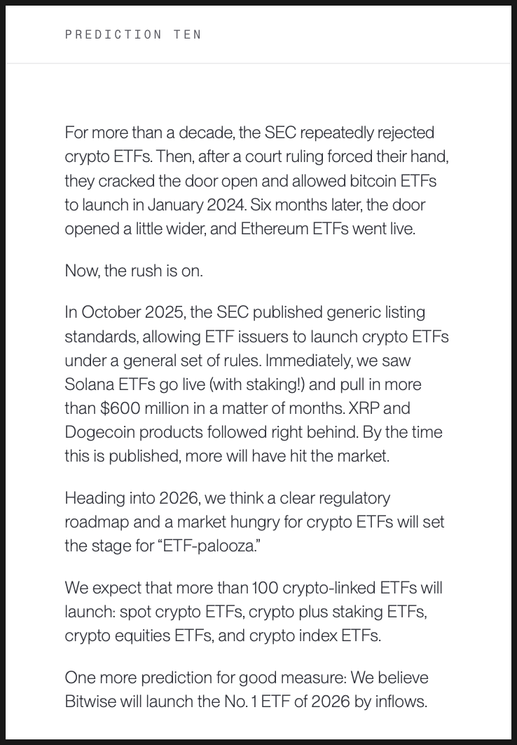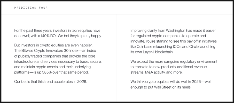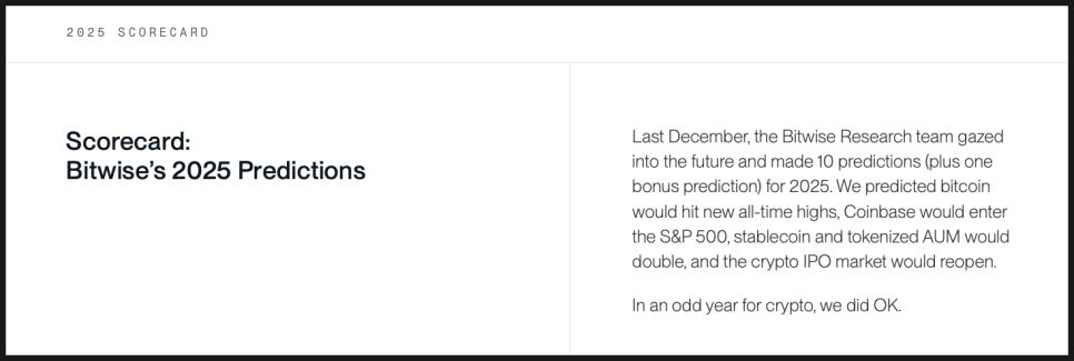 미국에서 가장 잘 알려진 크립토 전문 자산운용사 중 하나인 비트와이즈(Bitwise)도 2026년 예측 리포트를 내놨는데요. 비트와이즈는 비트코인, 이더리움 현물 ETF를 포함해 다양한 크립토 관련 투자 상품을 운용하고 있고, 기관 투자자를 대상으로 한 리서치로도 영향력이 있는데요. 제도권 금융 안에서 크립토가 어떤 위치로 이동하고 있는지를 구조적으로 해석하는 데 강점이 있는 곳입니다.