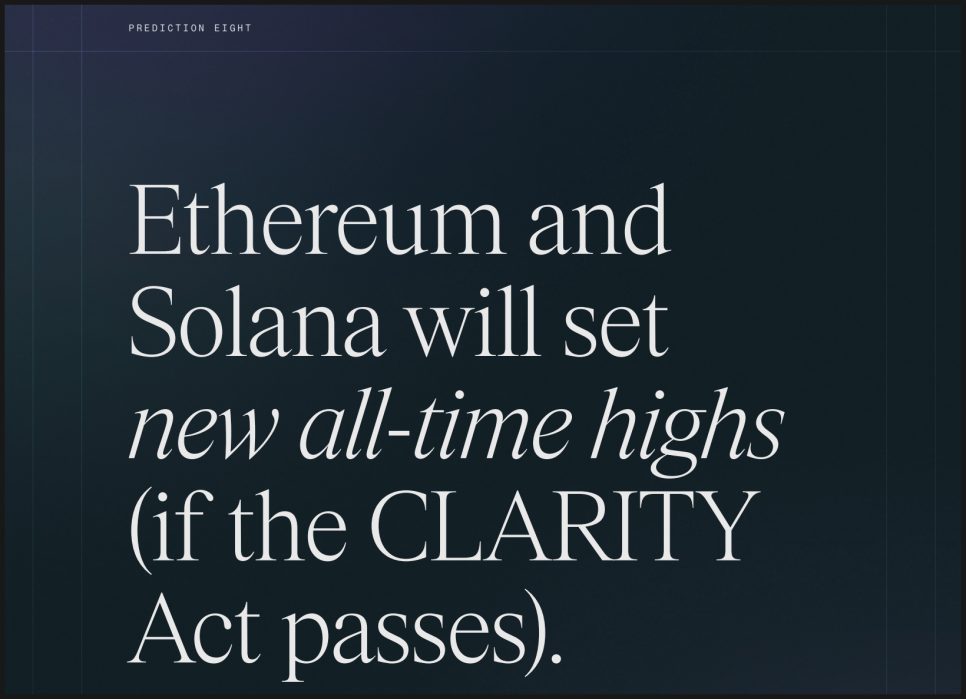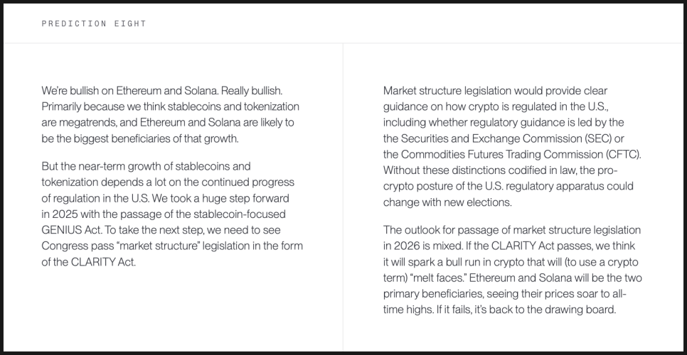 만약 이 법안이 2026년에 통과된다면, 비트와이즈는 크립토 시장 전반에 강한 모멘텀이 형성될 수 있다고 봅니다. 규제 리스크가 완화되면, 스테이블코인 발행사와 토큰화 프로젝트, 디파이와 결제 서비스가 본격적으로 확장될 수 있고, 이 활동의 상당 부분이 이더리움과 솔라나 위에서 이뤄질 가능성이 큽니다.