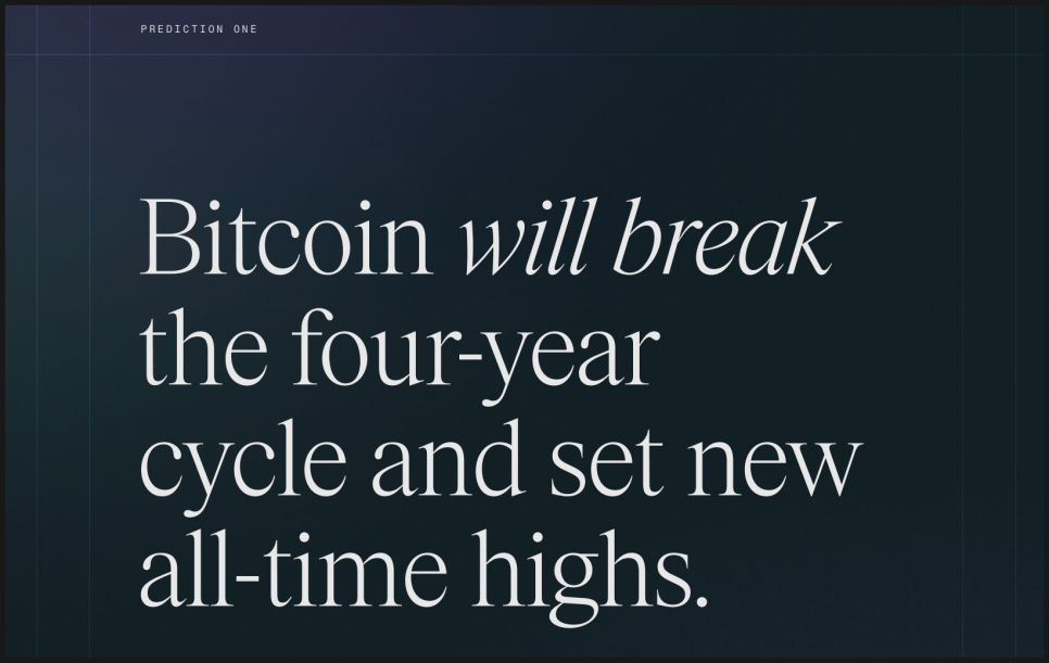 비트와이즈의 첫 번째 예측은 비트코인이 기존의 4년 사이클을 깨고 다시 사상 최고가를 경신할 수 있다는 주장입니다. 과거에는 반감기, 금리 급변, 과도한 레버리지 붕괴가 사이클을 만들었지만, 이제는 그 영향력이 크게 약해졌다는 설명입니다.