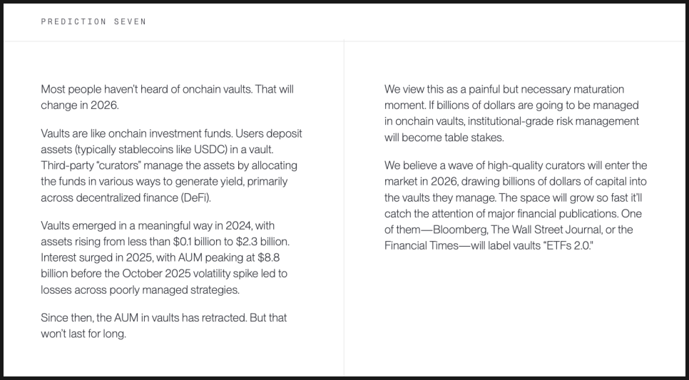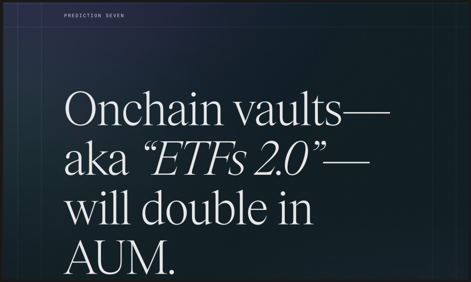 비트와이즈의 일곱 번째 예측은 아직 대중적으로는 잘 알려지지 않은 영역을 다룹니다. 바로 ‘온체인 볼트(onchain vault)’입니다. 지금은 생소하지만, 비트와이즈는 2026년을 기점으로 이 구조가 본격적으로 주목받을 수 있다고 봅니다.