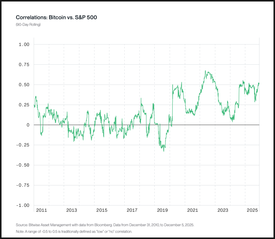 비트와이즈가 제시한 자료를 보면, 비트코인과 S&P 500의 90일 이동 상관계수는 대부분의 기간 동안 0.5를 넘지 않았습니다. 통계적으로 0.5 이하는 ‘낮은 상관관계’ 혹은 ‘중립적 관계’로 분류됩니다. 즉, 특정 시기에는 함께 움직인 적이 있지만, 장기적으로 보면 항상 같은 방향으로 움직였다고 보기는 어렵다는 것입니다.
