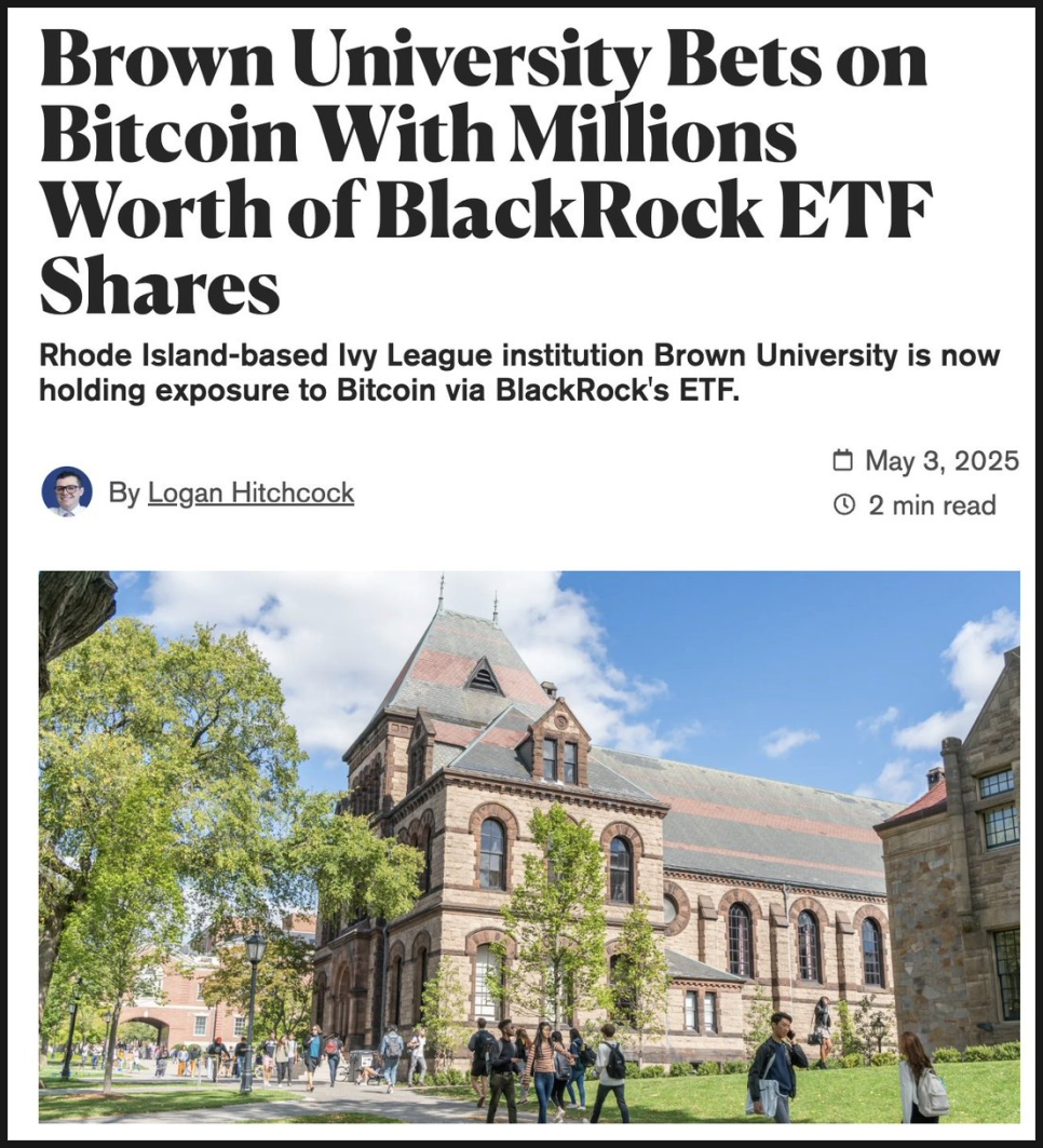 2025년 초, 브라운대학교는 아이비리그 가운데 처음으로 비트코인에 직접 노출되는 결정을 내렸습니다. 약 500만 달러 규모의 비트코인 ETF를 편입한 것입니다. 절대적인 금액만 보면 크지 않습니다. 하지만 대학 기금의 투자 결정에서 중요한 것은 규모보다 ‘선례’입니다.