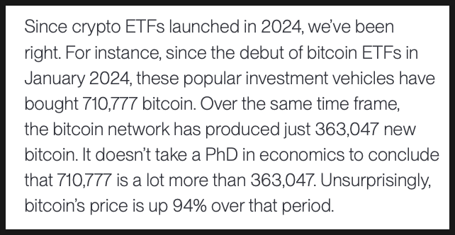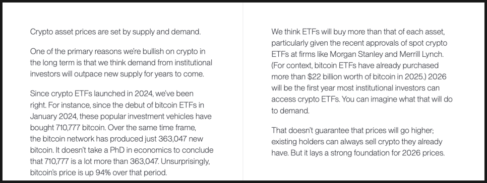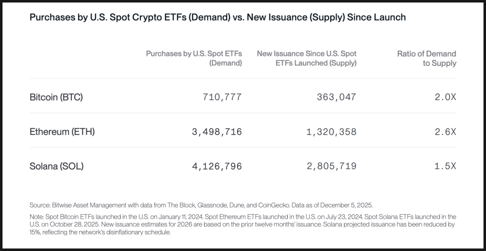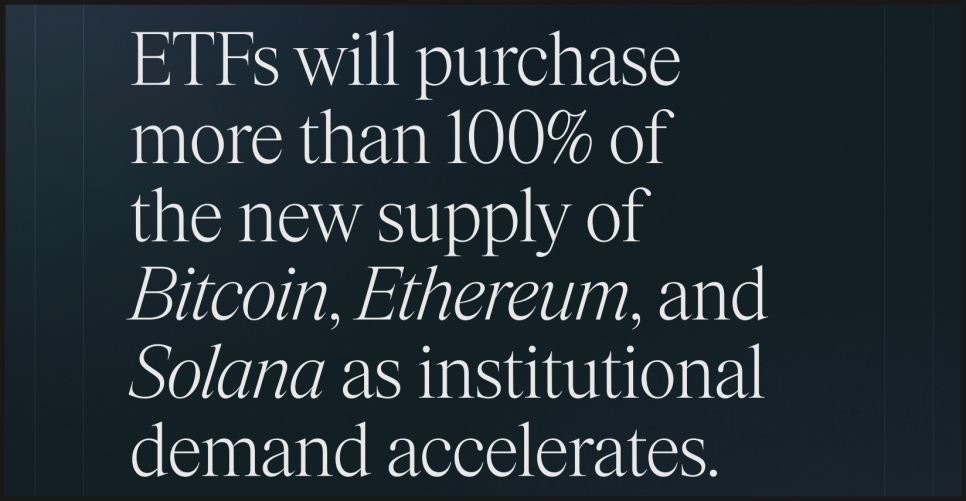 세 번째, 비트와이즈가 2026년을 낙관적으로 보는 가장 현실적인 근거 중 하나는 수급 구조입니다. 크립토 자산의 가격은 결국 공급과 수요로 결정되는데, 이 균형이 점점 한쪽으로 기울고 있다는 판단입니다. 특히 ETF를 통한 기관 수요가, 네트워크에서 새로 발행되는 물량을 지속적으로 초과할 가능성에 주목합니다.