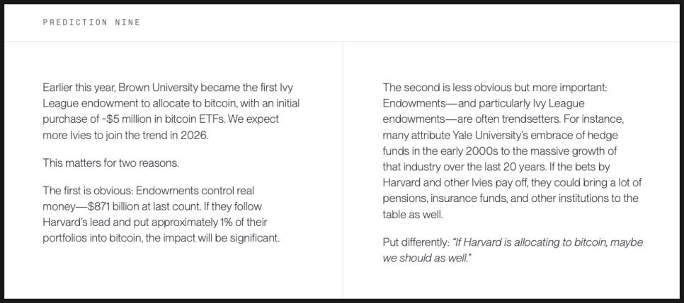 아홉 번째, 비트와이즈는 2026년까지 아이비리그 대학의 절반이 암호화폐에 투자할 가능성을 제시합니다. 금액보다 중요한 것은 상징성입니다. 대학 기금은 전통적으로 다른 기관 투자자들의 기준점 역할을 해왔고, 이들의 선택은 연기금과 보험사로 확산될 가능성이 큽니다.