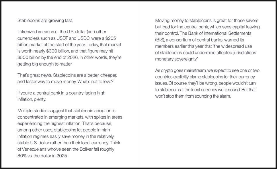 비트와이즈는 2026년을 전후로, 이런 긴장감이 표면 위로 올라올 가능성이 높다고 봅니다. 즉, 몇몇 국가가 자국 통화 불안이나 환율 급등의 원인으로 스테이블코인을 공개적으로 지목하는 장면이 나올 수 있다는 것입니다. 규제 강화, 사용 제한, 혹은 정치적 발언 형태로 나타날 가능성도 있다는 거죠.