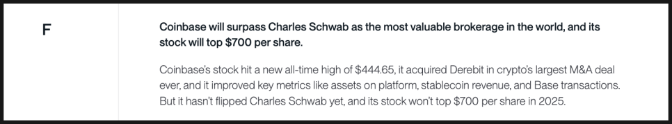 코인베이스 주가에 대한 예측은 명확한 실패 사례입니다. 코인베이스가 찰스 슈왑을 시가총액 기준으로 넘어설 것이라는 전망, 그리고 주가 700달러 돌파는 현실이 되지 않았습니다. 물론 코인베이스는 대형 인수합병을 성사시켰고, 실적도 개선됐지만, 예측 자체는 빗나갔습니다. 이 항목은 F입니다.