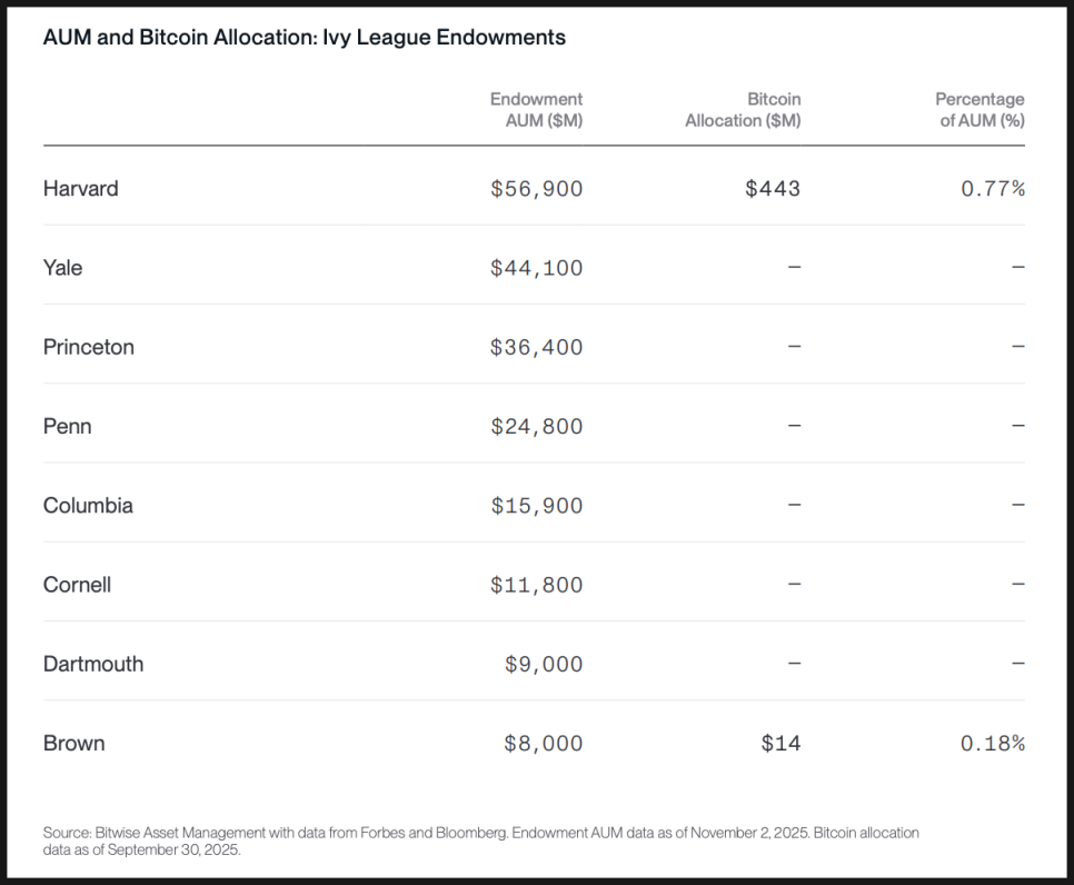 비트와이즈는 크립토에서도 비슷한 흐름이 나타날 수 있다고 봅니다. 하버드나 브라운 같은 학교가 크립토에 의미 있는 성과를 낸다면, 다른 대학 기금뿐 아니라 연기금, 보험사, 공제회 같은 보수적인 기관들도 “아이비리그가 하는데, 우리도 검토해야 하지 않나”같은 질문을 던지게 된다는 거죠.