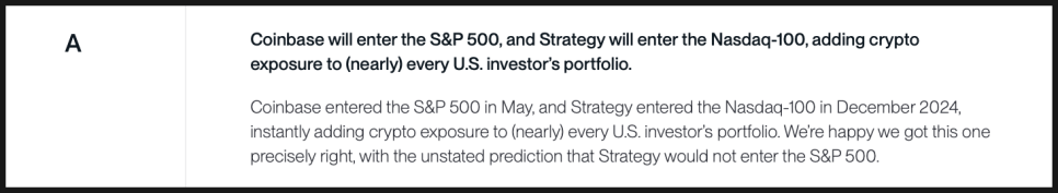 코인베이스의 S&P 500 편입과 스트래티지의 나스닥100 편입 예측도 정확히 맞아 떨어졌는데요. 이건 거의 시점까지 정확하게 맞았습니다. 결과적으로 미국 주식에 투자하는 거의 모든 투자자가, 의도하지 않더라도 크립토 산업에 간접 노출되는 구조가 만들어졌습니다. 그래서 이 항목도 A를 줬죠.