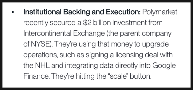 두 번째, 폴리마켓은 최근 뉴욕증권거래소의 모회사인 ICE로부터 대규모 투자를 유치했습니다. 이 자금은 단순한 운영비가 아니라, 플랫폼을 확장하고 제도권과 연결하는 데 쓰이고 있는데요. 미국 하키 리그인 NHL과의 공식 라이선스 계약, 구글 파이낸스와의 데이터 연동이 상징적인 사례로 꼽히고 있습니다. 예측 시장이 더 이상 변두리 서비스가 아니라, 금융 정보 흐름의 일부로 편입되고 있다는 신호로 해석할 수 있습니다.