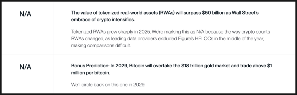 실물자산 토큰화(RWA)에 대한 예측과 2029년 비트코인이 금 시가총액을 추월할 것이라는 보너스 예측은 평가 자체를 유보했습니다. 데이터 기준이 바뀌어 비교가 어려웠고, 장기 전망은 아직 판단할 시점이 아니라는 이유입니다.