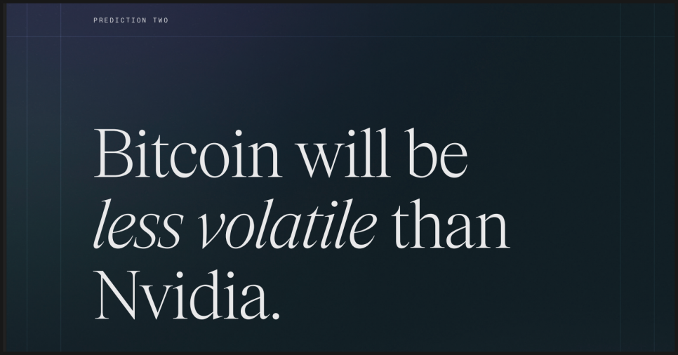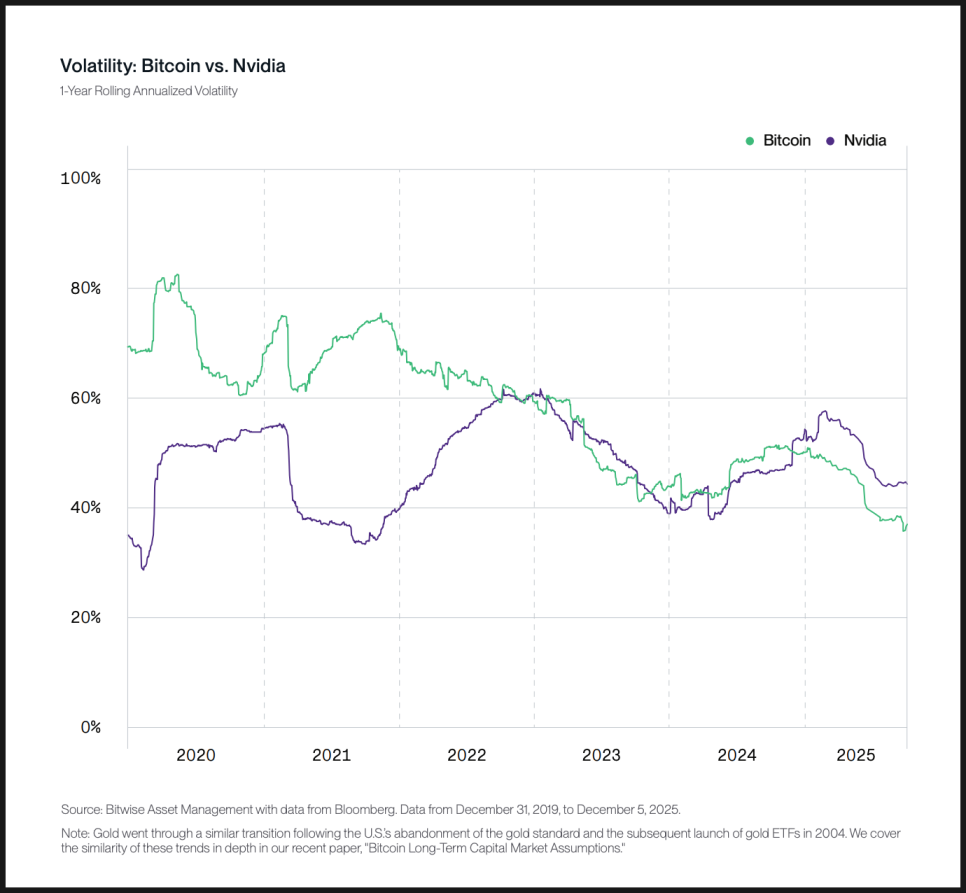 비트와이즈가 제시하는 데이터에 따르면 2025년 한 해 동안 비트코인의 변동성은 미국 증시에서 가장 인기 있는 종목 중 하나인 엔비디아보다 낮은 수준을 유지했습니다. 단기적인 급등락이 눈에 띄기 때문에 체감상 더 위험하게 느껴질 뿐, 통계적으로 보면 이미 주식 시장의 대표적인 성장주보다 안정적인 구간에 들어섰다는 것입니다.