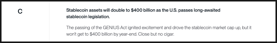 스테이블코인과 관련된 예측은 애매한 성적표를 받았습니다. 미국에서 스테이블코인 법안이 통과되며 시장 규모가 크게 성장한 것은 사실이지만, 연말 기준 4천억 달러에는 도달하지 못했습니다. 그래서 C입니다. 방향은 맞았지만 속도가 부족했다는 평가입니다.
