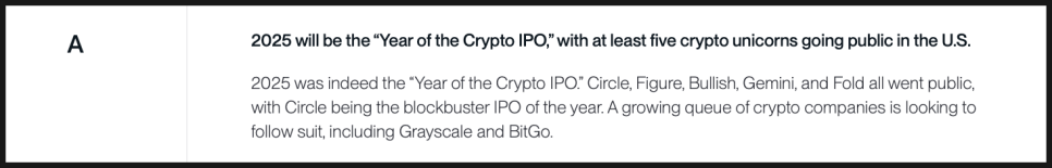 2025년이 ‘크립토 IPO의 해’가 될 것이라는 전망은 거의 그대로 실현됐다고 주장하는데요. 서클, 제미니, 불리시, 피겨 등 주요 크립토 기업들이 상장했고, 특히 서클은 시장의 주목을 받는 대형 IPO가 됐습니다. 이 항목은 A입니다.