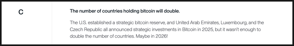 국가 차원의 비트코인 보유 확대 역시 부분적으로만 맞았습니다. 미국이 전략적 비트코인 준비금 개념을 도입했고, 몇몇 국가가 참여했지만 “두 배 증가”까지는 아니었습니다. 역시 C입니다.