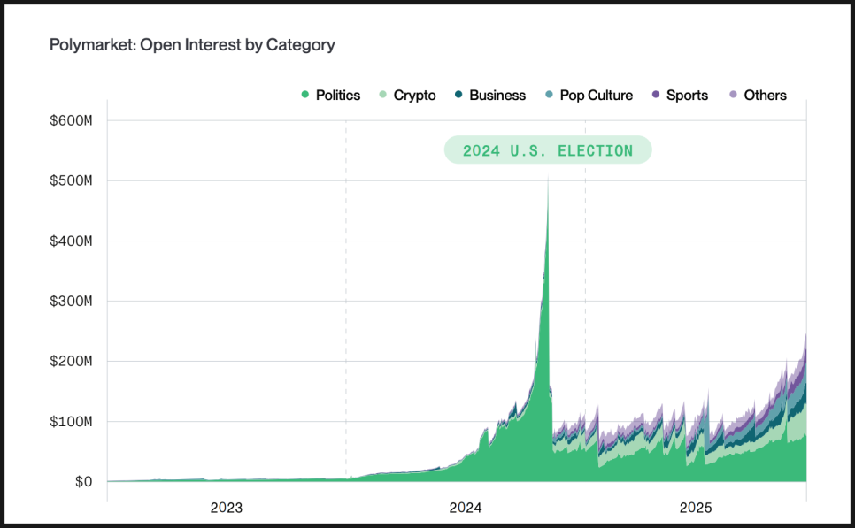 폴리마켓(Polymarket)은 2024년 미국 대선을 계기로 한 번 크게 주목을 받았습니다. 당시 대선 기간 동안 미결제약정(Open Interest)이 약 5억 달러까지 치솟으며, 여론조사보다 빠르고 정확하다는 평가를 받았습니다. 하지만 선거가 끝난 뒤에는 열기가 빠르게 식었고, 미결제약정 규모도 약 1억 달러 수준으로 줄어들었습니다.