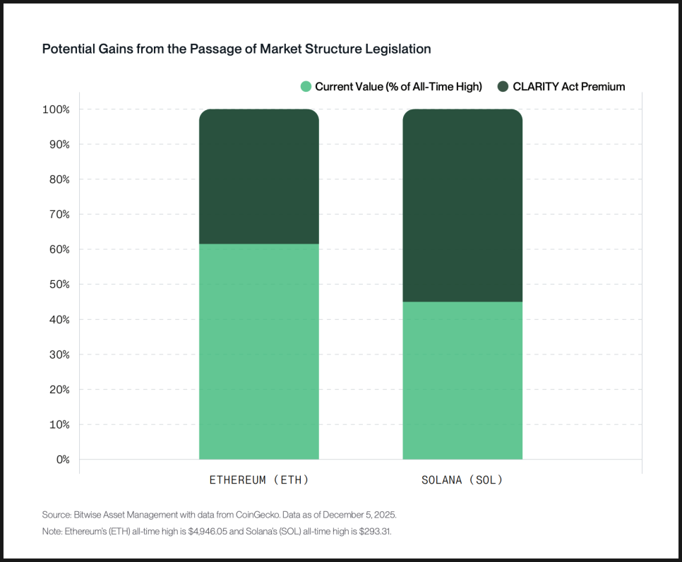 그래서 나오는 결론이 ‘사상 최고가’입니다. 비트와이즈는 CLARITY Act가 통과될 경우, 이더리움과 솔라나가 기존 최고가를 다시 넘어설 수 있는 여건이 만들어진다고 봅니다. 이는 단기적인 투기 수요보다는, 제도권 자금과 실사용 확대로 인한 평가 변화에 가깝다는 설명입니다.