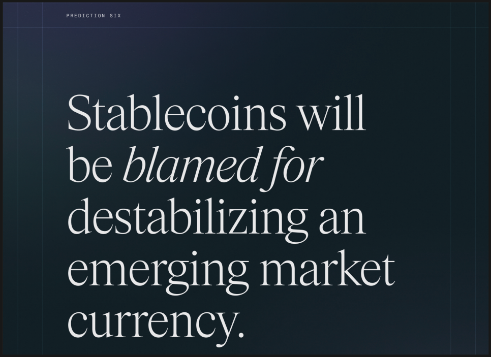 여섯 번째, 스테이블코인은 신흥국 통화 위기의 원인으로 지목될 수 있다는 예측입니다. 스테이블코인의 영향력이 커지면서, 일부 신흥국에서는 통화 불안의 책임을 스테이블코인에 돌리는 상황이 실제로 벌어질 수 있다는 것입니다.