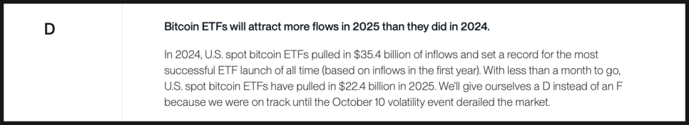 반면, 비트코인 ETF 자금 유입에 대한 예측은 실패에 가깝습니다. 2025년 비트코인 ETF 자금 유입이 2024년을 넘어설 것이라는 전망이었지만, 실제로는 그렇지 못했습니다. 다만 연중 대부분의 기간 동안은 추세가 맞았고, 10월 급격한 변동성 이후 흐름이 꺾였다는 점을 감안해 F 대신 D를 줬습니다. 꽤 후한 편입니다.