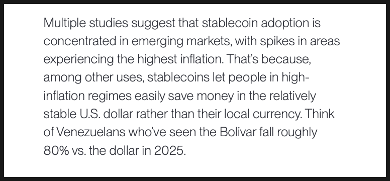 문제는 이 확산이 어디에서 가장 빠르게 일어나고 있느냐입니다. 여러 연구에 따르면 스테이블코인 사용은 주로 신흥국, 그중에서도 인플레이션이 심각한 국가에서 급증하는 경향을 보입니다. 자국 통화 가치가 빠르게 하락하는 환경에서, 달러 가치에 연동된 자산으로 저축할 수 있다는 점은 개인에게 매우 매력적인 선택지이기 때문입니다.