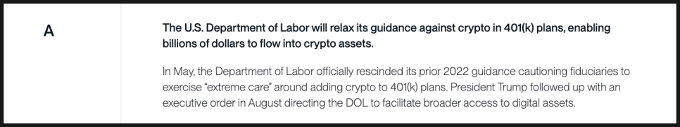 미국 노동부(DOL)가 401(k) 연금에서 크립토에 대한 경계 수위를 완화할 것이라는 전망 역시 적중했습니다. 노동부는 2022년의 강경 가이던스를 공식 철회했고, 이후 대통령 행정명령을 통해 디지털 자산 접근성을 확대하는 방향이 명확해졌습니다. 이 항목도 A 등급입니다.