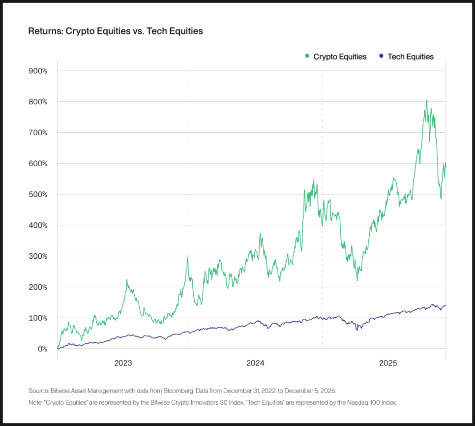 실제로 지난 3년간을 보면 기술주는 약 140% 상승했습니다. 하지만 같은 기간, 거래소·인프라·보안·결제 등 크립토 생태계를 떠받치는 상장 기업들로 구성된 지수는 약 585% 상승했습니다. 단순한 테마주가 아니라, 크립토 시장이 커질수록 직접적으로 수익이 늘어나는 기업들이라는 점에서 차이가 났다는 해석입니다.
