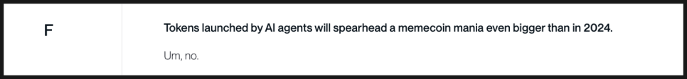 반면, AI 에이전트 토큰이 밈코인 광풍을 주도할 것이라는 예측은 완전히 빗나갔습니다. 비트와이즈도 이 항목에 대해서는 별다른 변명을 하지 않습니다.