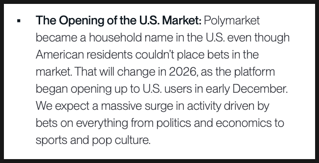 이 흐름을 보면서 많은 사람들이 폴리마켓의 전성기는 결국 대선이라는 특수한 이벤트 덕분이었고, 다시 그 수준으로 올라가려면 또 다른 대통령 선거가 필요하지 않겠느냐고 생각했는데, 비트와이즈는 이 해석에 동의하지 않습니다. 여러가지 변화 덕분에, 오히려 2026년에는 대선이 없어도 폴리마켓이 2024년의 기록을 넘어설 가능성이 있다고 봅니다.