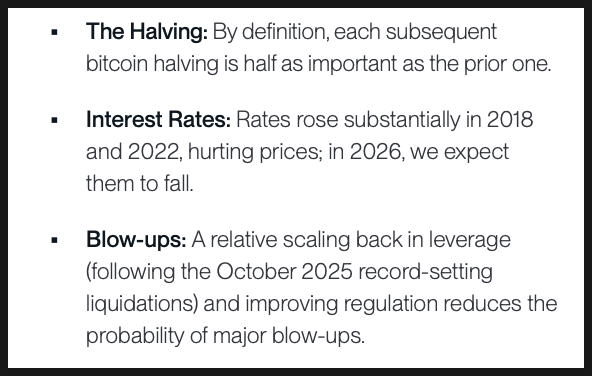 정리하자면, 반감기는 갈수록 효과가 줄고 있고, 2026년에는 금리 하락 가능성이 있으며, 2025년 대규모 청산 이후 레버리지는 눈에 띄게 줄었습니다. 여기에 2024년부터 시작된 현물 ETF를 통한 기관 자금 유입이 2026년에 본격화될 가능성이 크다는 점이 결정적입니다. 비트와이즈는 이 변화로 인해 ‘4년 주기’라는 설명 자체가 점점 설득력을 잃을 것으로 봅니다.