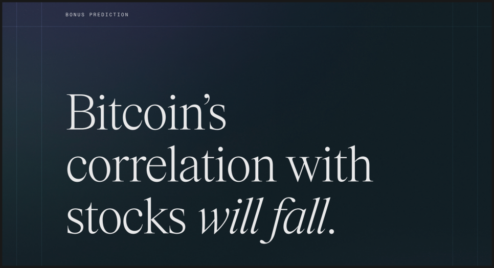 마지막 보너스로 비트와이즈는 비트코인이 주식 시장으로부터 디커플링될 거라고 보고 있습니다. 보통 투자자들은 비트코인은 결국 위험자산이고, 주식이 흔들리면 같이 흔들린다고 생각하는데, 상관관계가 낮아질 거라는 거죠.