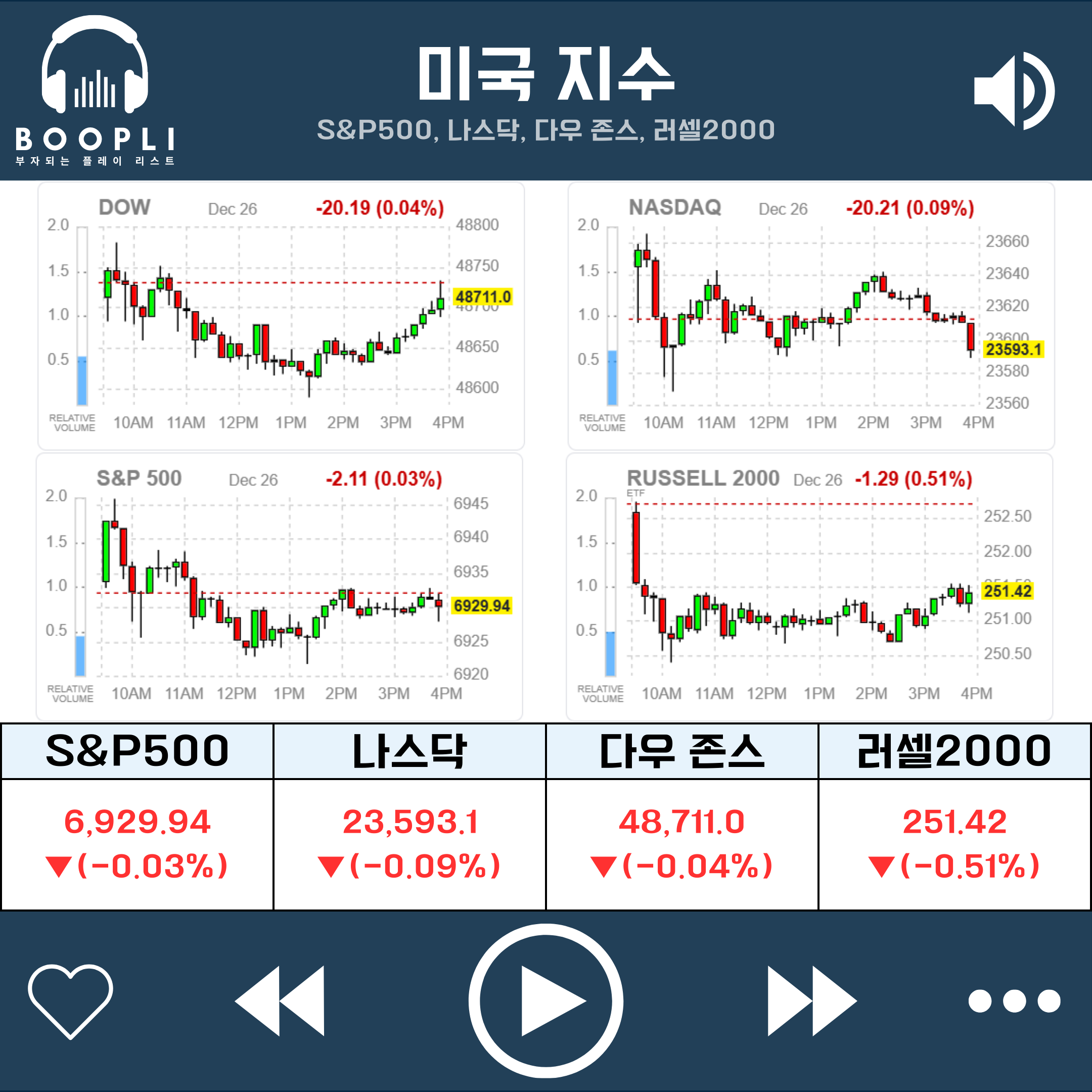 전일 미국 증시는 연말 연휴로 거래가 크게 위축된 가운데 S&P500(-0.03%), 다우(-0.04%), 나스닥(-0.09%), 러셀2000(-0.51%) 등 주요 지수가 모두 소폭 하락 마감