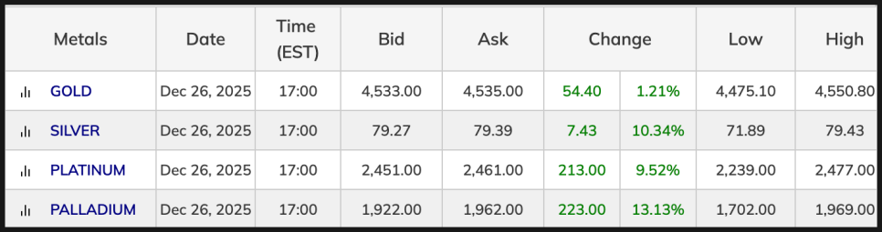 미국이 크리스마스 당일 나이지리아에서 이슬람국가(IS) 관련 목표물을 공습했고, 베네수엘라 제재 유조선을 차단하면서 지정학적 긴장감이 다시 높아졌다는 점도 귀금속 가격에는 우호적으로 작용한 것으로 보입니다.