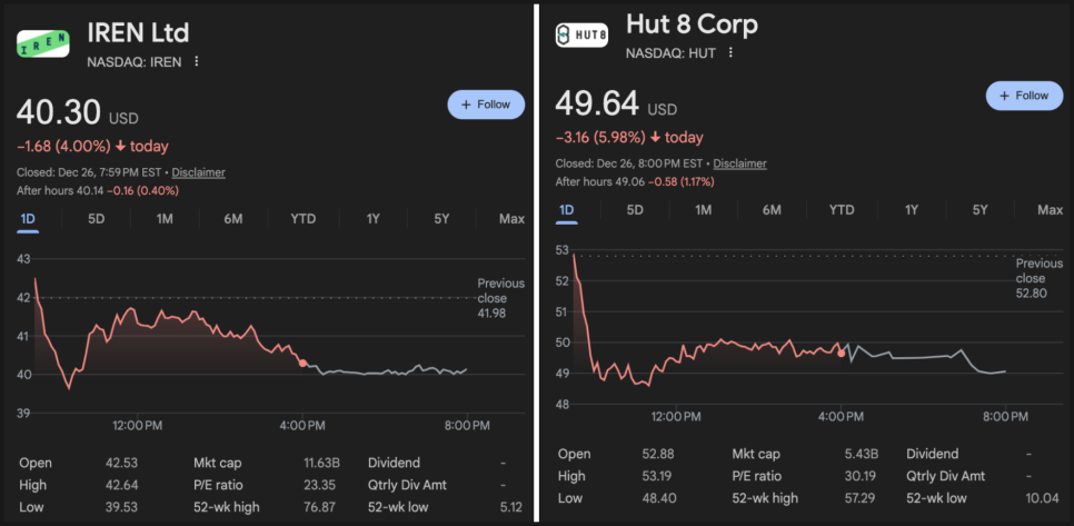 특히 비트코인 채굴주들의 타격이 컸습니다. 채굴을 넘어 AI 인프라 쪽으로 사업을 전환한 기업들까지 가리지 않고 매물이 나왔는데요. 아이렌, 사이퍼 마이닝, 테라울프, 마라톤 디지털 모두 5% 이상 하락했습니다. 최근 일주일 동안 자체 AI 전략으로 주목받았던 헛8은 이날 6%나 밀렸습니다.