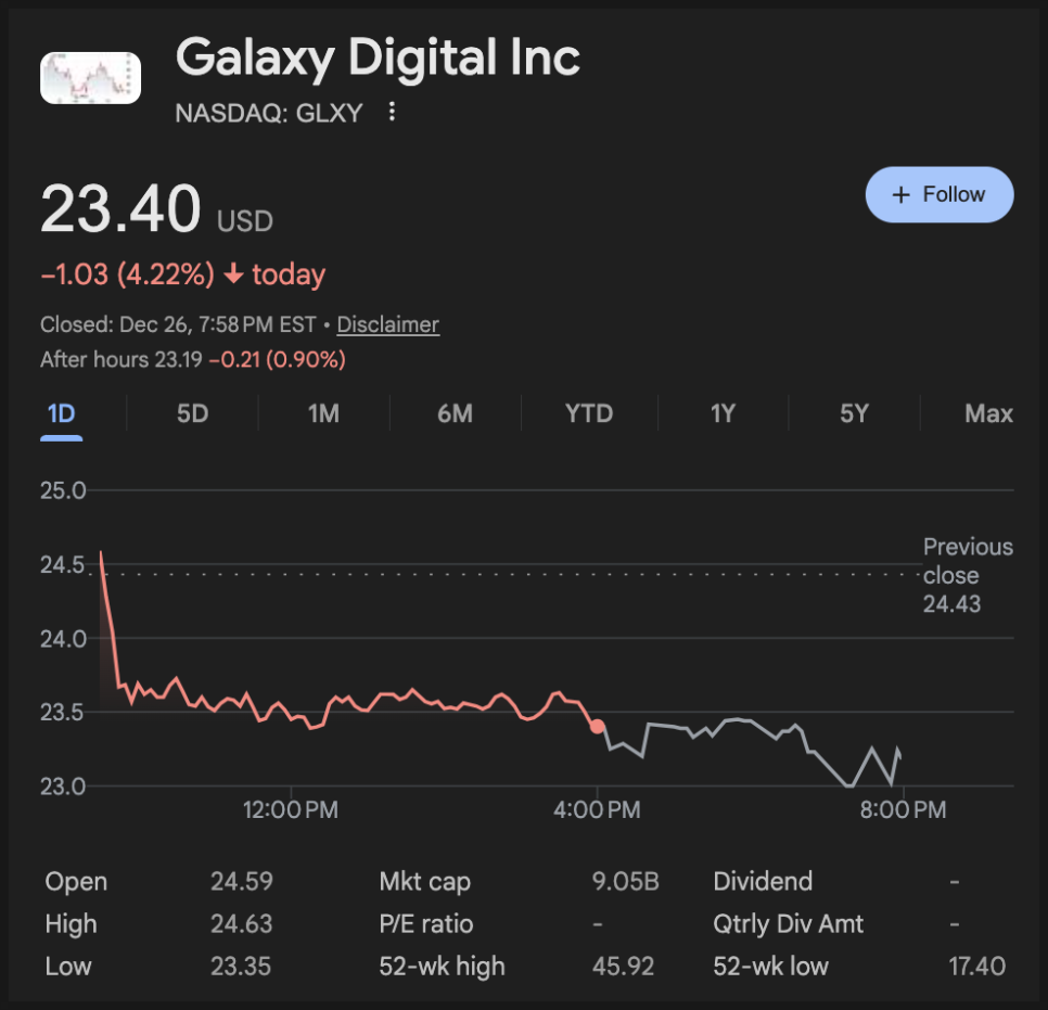 반면 제미니, 불리시, 갤럭시 디지털 주가는 4% 이상 떨어졌습니다.