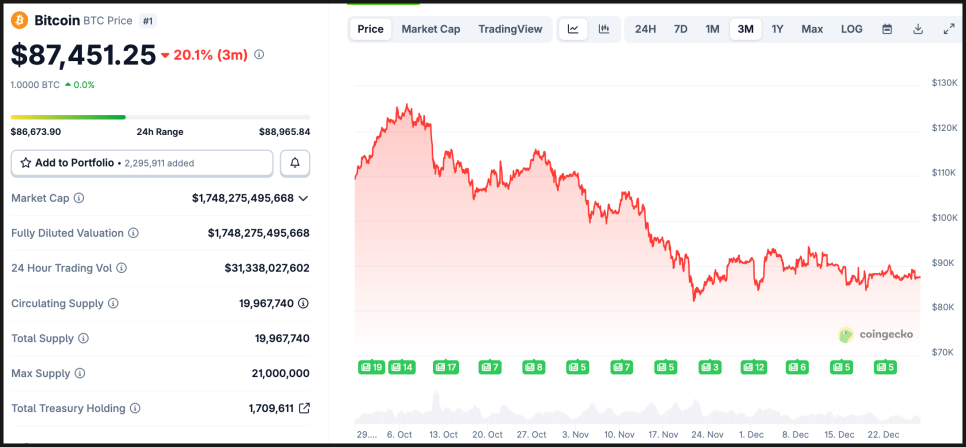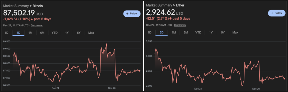 비트코인은 금요일 새벽, 미국이 잠든 사이 한때 8만9천 달러 선을 살짝 넘기기도 했는데요. 하지만 크리스마스 연휴 이후 미국 주식시장이 개장하자마자 빠르게 밀리면서 다시 8만7천 달러 아래로 내려왔습니다.