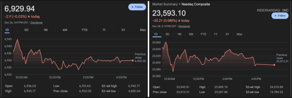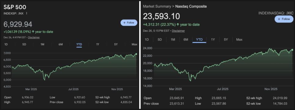그래도 미국 주식시장은 연말로 갈수록 안정적인 흐름을 유지하고 있습니다. S&P500와 나스닥은 현재 사상 최고가 구간에서 거래되고 있습니다. 12월 후반 내내 이어진 랠리가 그대로 유지된 셈이죠. 연간 기준으로 보면 S&P500은 올해 약 18% 상승했고, 나스닥은 2025년 들어 20% 이상 올랐습니다.