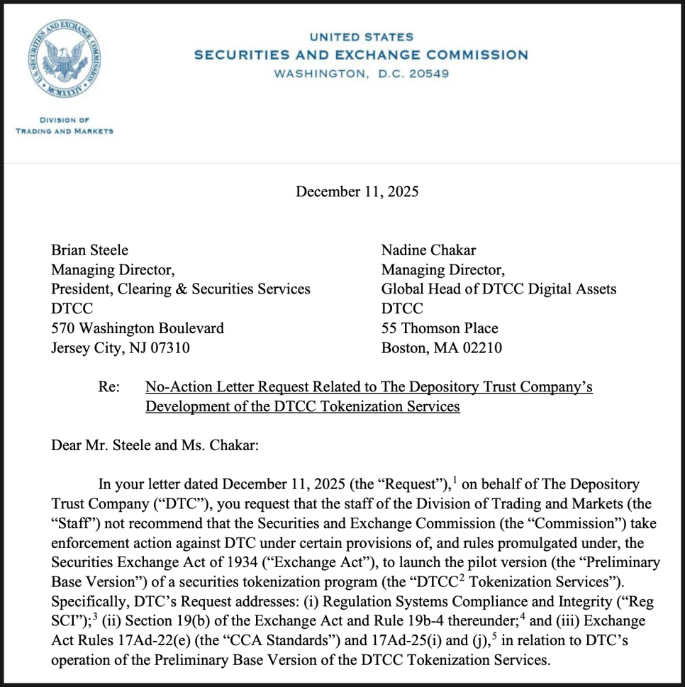 실제로 SEC는 최근 DTC, 쉽게 말해 미국 증권 결제의 핵심 기관에 토큰화 서비스를 해도 된다는 노액션 레터를 내줬습니다. 이로 인해 러셀1000에 포함된 주식, 주요 지수 ETF, 미국 국채 같은 자산을 아주 제한된 범위 안에서 토큰화해보는 실험이 가능해졌습니다.