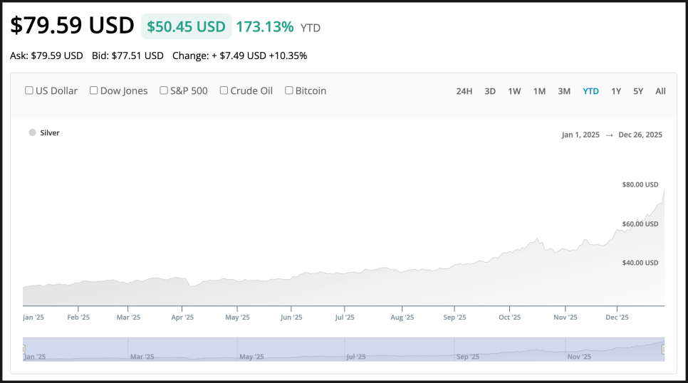 특히 은의 경우, 10월에 있었던 쇼트 스퀴즈 이후 공급 차질이 완전히 해소되지 않은 상황에서 투기성 자금까지 유입되며 현물 시장의 압박이 계속되고 있다는 점이 가격을 더 자극하고 있습니다. 은은 2025년 초 약 30달러에서 시작해 연초 대비 약 160% 상승했고, 금 역시 올해만 70% 이상 올랐습니다.