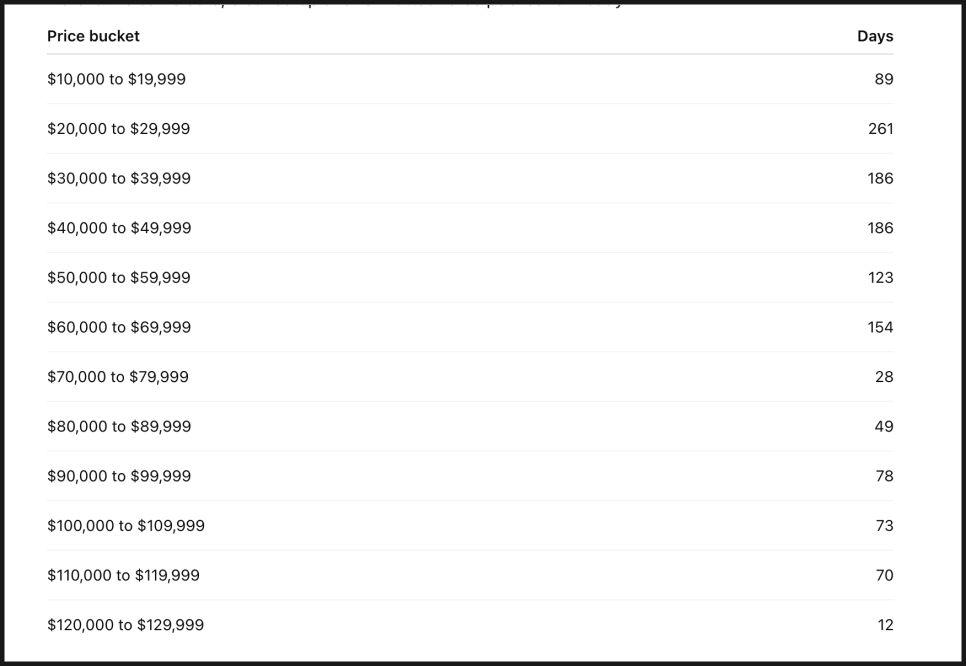 데이터를 보면 구간별 차이가 꽤 분명하게 드러납니다. 사상 최고가였던 12만 달러 이상 구간은 거래 기간이 워낙 짧아 참고 대상에서 제외하더라도, 7만~7만9,999달러 구간은 단 28거래일에 불과했습니다. 8만~8만9,999달러 구간도 49거래일에 그쳤죠. 반면 3만~3만9,999달러, 4만~4만9,999달러 구간은 각각 거의 200거래일에 가까울 정도로 오랫동안 가격이 머물렀습니다. 이 구간들이 얼마나 반복적으로 테스트되고 정리됐는지를 보여주는 대목입니다.