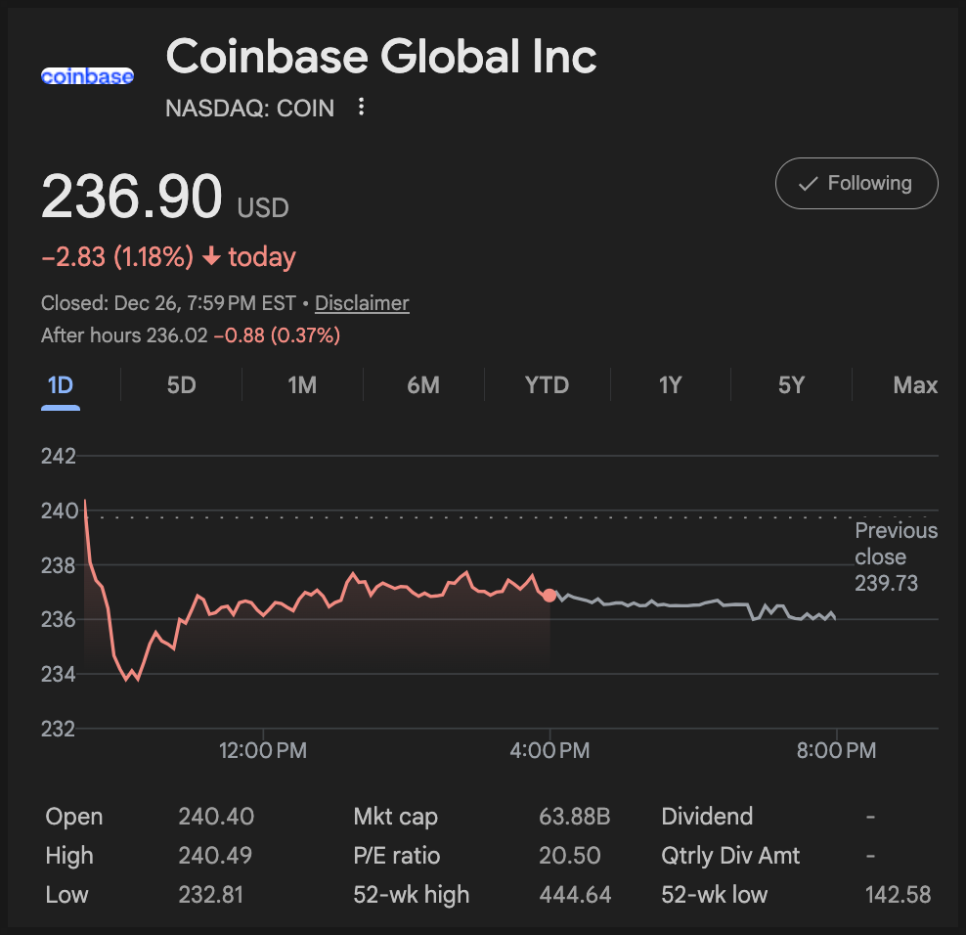 암호화폐 관련 주식들도 대부분 약세였습니다. 코인베이스는 클리어스트리트라는 리서치회사 소속 오웬 라우라는 애널리스트가 2026년 가장 유망한 핀테크 아이디어 중 하나로 꼽았음에도 불구하고 약 2% 하락에 그쳤습니다. 그나마 선방한 편이죠.