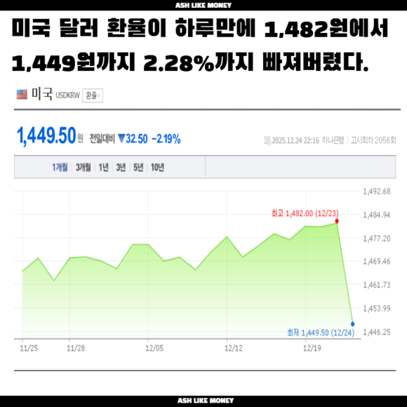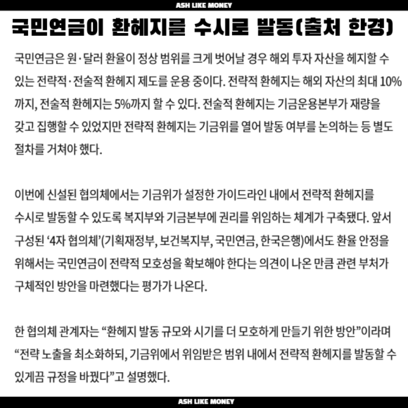 1,478~1,480원의 뉴노말 환율 시대에서 1,500원까지 상승할 수 있다는 두려움에 정부가 정말로 칼을 뽑고 환율에 개입한 것으로 보인다. 환율이 하루만에 2% 이상이 떨어졌는데, 이렇게 갑자기 떨어진 것은 본격적으로 국민연금이 환율 조정에 개입한 것으로 보인다. 한국은 현재 "환율 관찰대상국"으로 지정되어 미국에서 과거 환율조작으로 경고를 한 적이 있다. 국내 투자자들의 미국주식에 투자한 규모가 45조라고 발표하였는데, 반면 국내주식 투자액은 11조로 무려 4배나 많다고 한다.