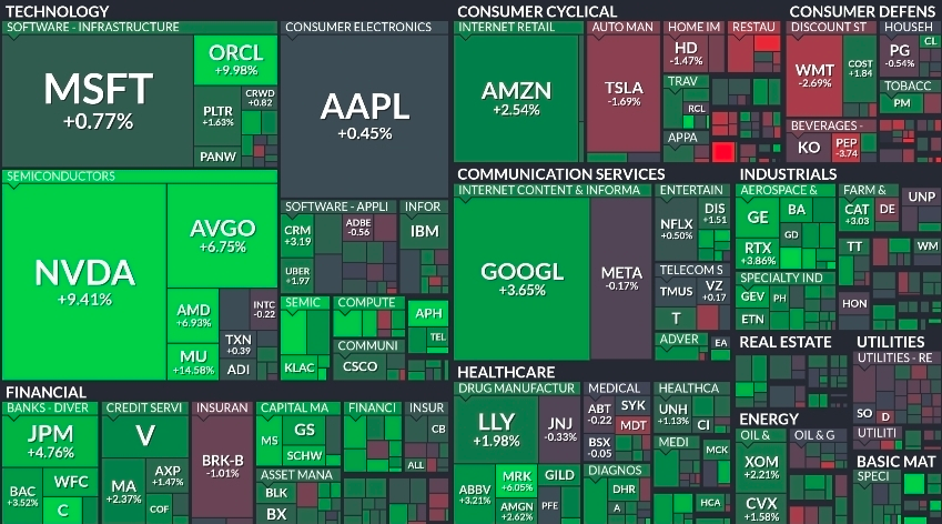 환율 시장에서는 원화 강세가 두드러졌습니다. 원/달러 환율은 전주 대비 34.80원(-2.35%) 하락하며 1,446.40원으로 마감했습니다. 이는 환율 변동성에 대한 우려를 다소 낮추는 긍정적인 신호로 해석됩니다. 섹터별 흐름을 보면 기술주의 강세가 뚜렷했습니다. 주간 증시 맵에 따르면 엔비디아(NVDA)가 +9.41% 급등하며 시장을 주도했고 브로드컴(AVGO)과 AMD도 각각 +6.75%, +6.93% 상승하며 반도체 섹터의 건재함을 과시했습니다. 빅테크 중에서는 구글(GOOGL)이 +3.65%, 아마존(AMZN)이 +2.54% 상승한 반면 테슬라(TSLA)는 -1.69% 하락하며 종목별로 차별화된 흐름을 보였습니다.