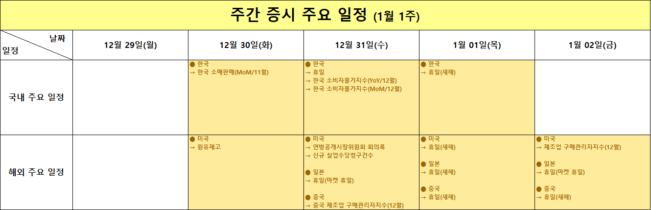 한국에서는 11월 소매판매(MoM) 데이터가 발표되어 내수 경기 흐름을 가늠해 볼 수 있습니다. 미국에서는 원유재고 발표가 예정되어 있어 에너지 관련주 투자자라면 유가 흐름을 체크해 보시기 바랍니다.