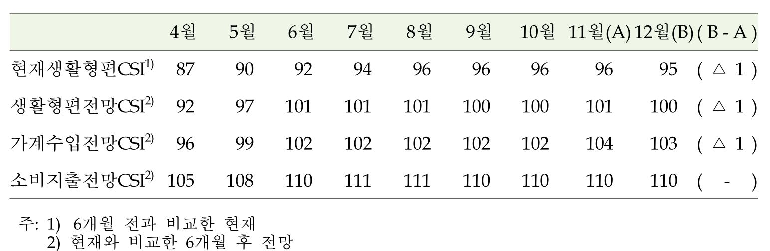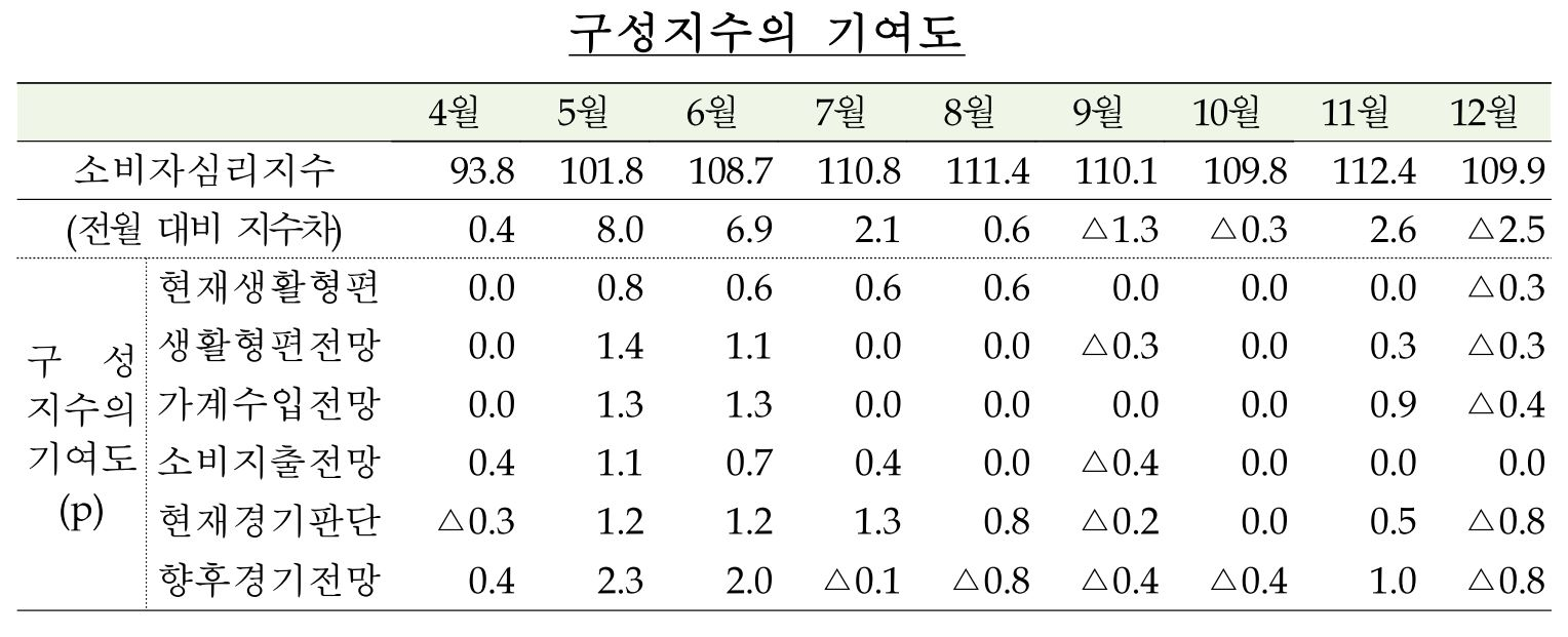 ㅇ 소비자들의 경제상황에 대한 심리를 종합적으로 나타내는 소비자심리지수는 12월 중 109.9로 전월 대비 2.5p 하락